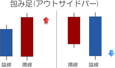 ローソク足のプライスアクションのひとつ。ひとつ前のローソク足を次の足で包み込んでいる組み合わせが包み足となります。