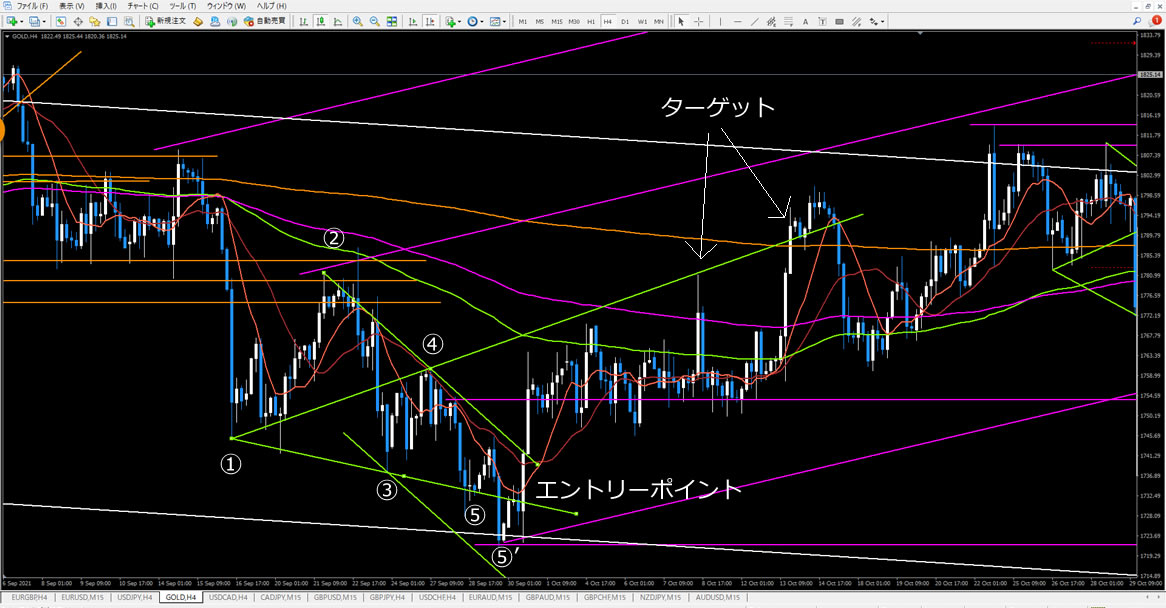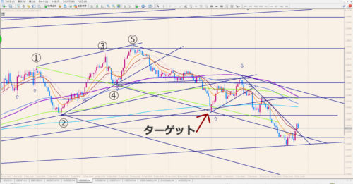 底値圏で上図のウェッジ完成後に①から④に引いた延長ラインに、⑤のポイントから反発上昇後にエントリーします。①④延長ラインが利確ポイントになります。