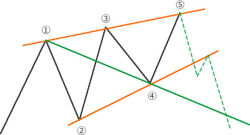 上昇圏で上図のウェッジ完成後に①から④に引いた延長ラインに、⑤のポイントから反発下落後にエントリーします。①④延長ラインが利確ポイントになります。